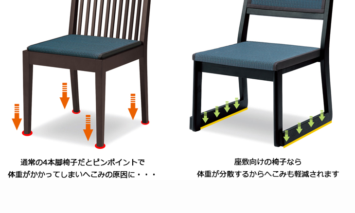 お座敷席、畳、カーペットでの使用を目的としたチェアです。 その特徴はなんといっても脚です。 そりのような脚は床との接地面が広いことにより安定し、がたつきを防ぐことができます。 しかし、これはカーペットや畳といった柔らかい床の場合であって フローリング等の硬い床では接地面が広いがゆえに不安定になり、がたついてしまうため不向きとなりますのでご注意ください。
